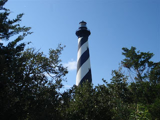 Today was a rest day. Because we had missed Cape Hatteras because the new bridge wasn't open, I decided to ride up to Hatteras and back. After breakfast, Jack, Al and I started a leisurely ride up Ocracoke Island. Although the town of Ocracoke is privately owned, the rest of the island is part of the Hatteras National Seashore. My concept of the Outer Banks was a narrow, continuous sand dune, bordered on both sides by water. While much of the OB does resemble my mental image, much of it is wooded or occupied by houses. Ocracoke Island is a little more than 12 miles long. I stopped to see the island ponies, descendants of Spanish horses left on the islands. I looked at my watch and realized that I was going to miss the ferry to Hatteras if I didn't hustle, so I raced the final few miles and just made the 10:00 AM ferry. Jack and Al were no where to be seen. Stuart was already at the ferry when I arrived, so I joined him for the ride up Hatteras to the famous lighthouse. Several years ago, erosion threatened to destroy the lighthouse, so they moved it several hundred yards inland! The characteristic black and white barber pole paint job was to make Hatteras distinguishable from the sea. Since I don't like high places, I waited for Stuart to climb to the top of the lighthouse. Afterwards, we stopped at a grocery store to buy lunch which we consumed in the parking lot. On the way back to the ferry, we spotted Barbara and Beverly headed north, obviously headed for the lighthouse as well. The return trip to Ocracoke was fast because we had a tail wind. What a great rest day.